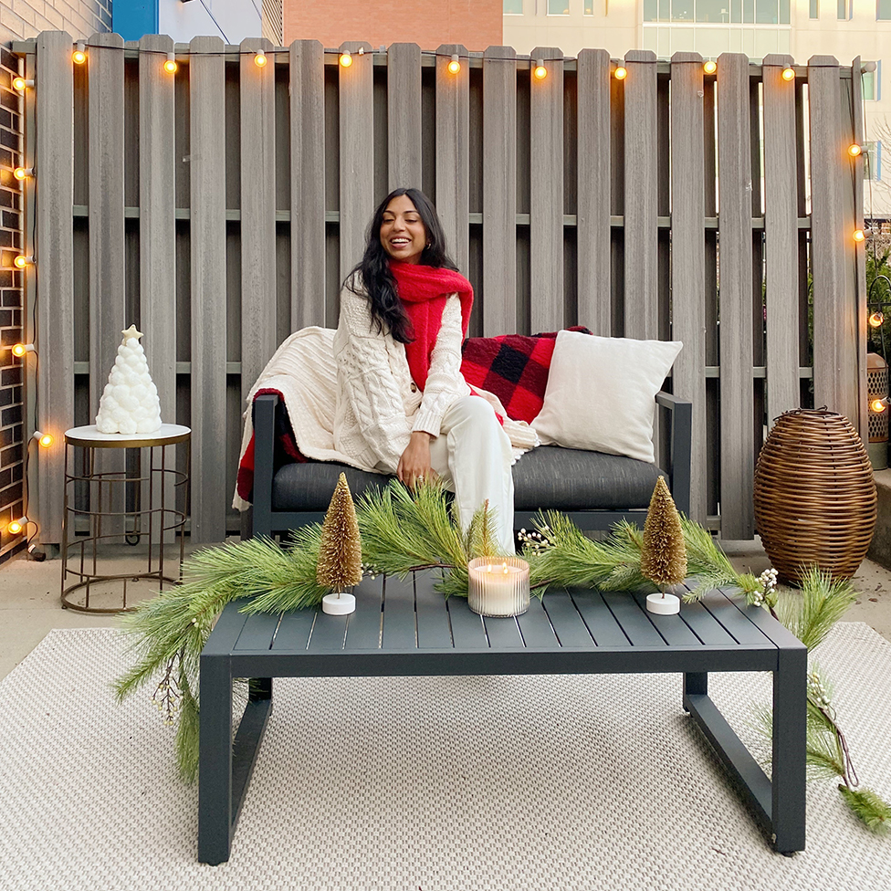 I had so much fun taking this holiday photos! I love the holiday season and it was so fun to decorate my patio for this. Get festive to set the scene – for this I already had lights and I added a tablescape and fun candles! Try to go with the theme of your outfit to create a backdrop. I’ve seen so many beautiful photos with draping a cloth for a clean backdrop, adding florals or creating a picnic in the park! The options are endless. For this shot, I set up my tripod and used a Bluetooth clicker. I mixed up my poses for this, but ultimately went for a cozy vibe so lounging on the couch was only natural!