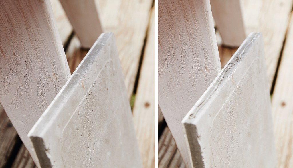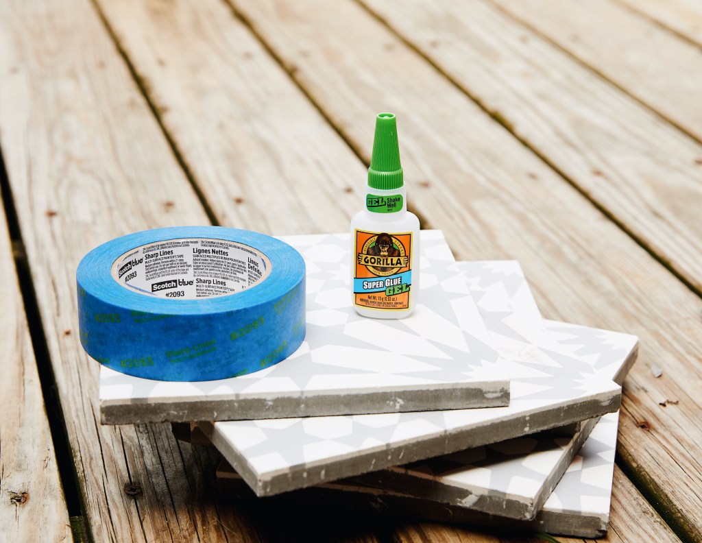 - Place two pieces of painters tape on the outer corner of the “L” to hold the two tiles together.