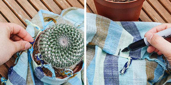 1. Take your fabric and wrap it around the top of your planter.