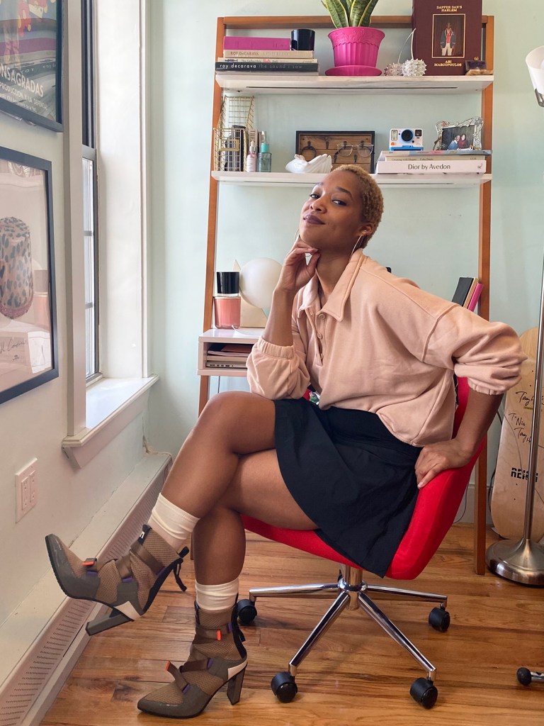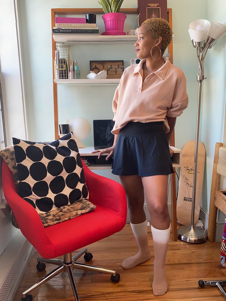 I never thought I’d say this but…maybe it’s time I give my leggings a break! My gams are craving the graze of free-flowing skirts and dresses, like the made-to-move OFFLINE Nylon Skirt in a classic black, which I paired with Aerie’s super cozy Fleece-Of-Mind Cropped Polo in a neutral. For even more flirty attitude, try one of our Ruffle Mini Skirts in a fun print (I added a sassy bootie to dress my outfit up)!