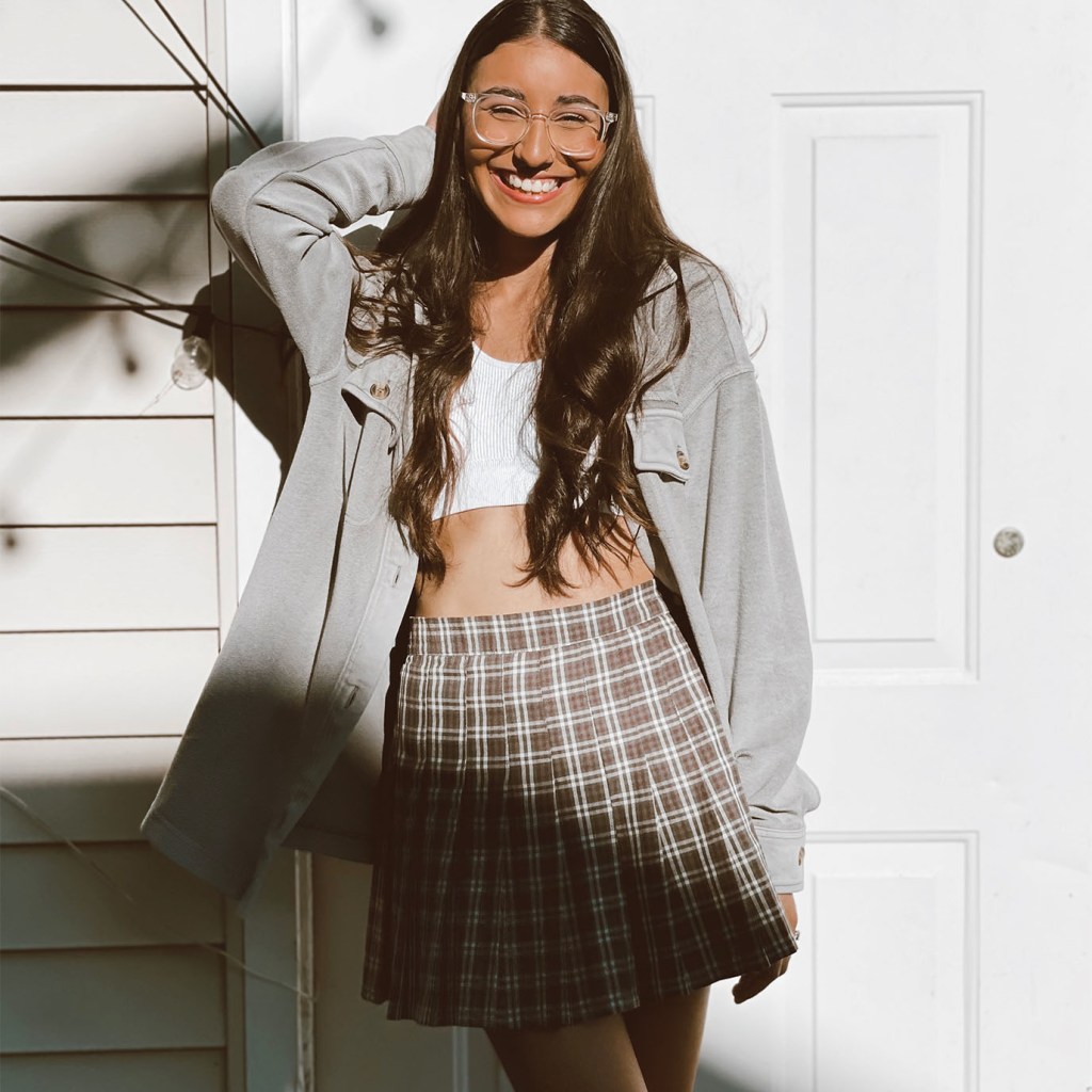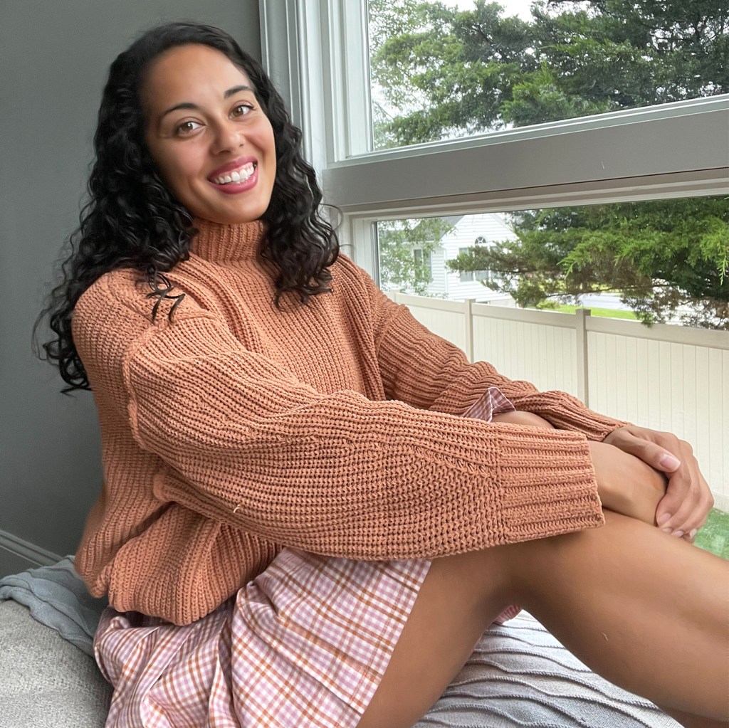 Katalyna: I’m celebrating my Colombian heritage this month by spending time with family from multiple generations. The best way to experience company is around the dinner table! I’m styling my Aerie Chenille Sweater with my Aerie pleated skirt for a cozy, feminine dinner look.