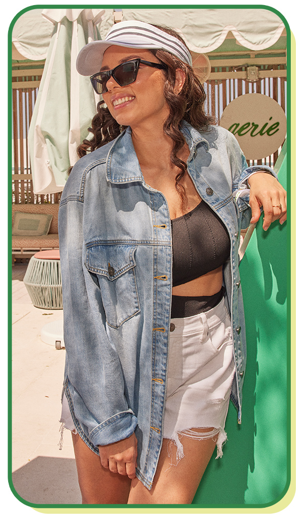 Get the look: Shine Double String Triangle Bikini Top, Pool-to-Party Cover Up, Distressed Daydream Denim Short