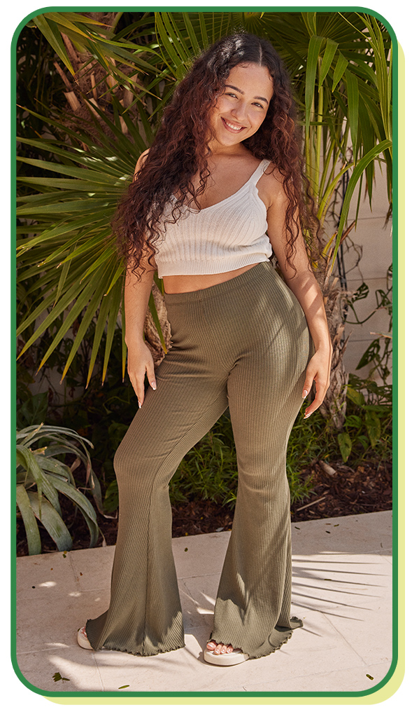 Get the look: Pool-to-Party Cover Up, Bikini Top, Kick-It Ribbed High Waisted Super Flare Pant,