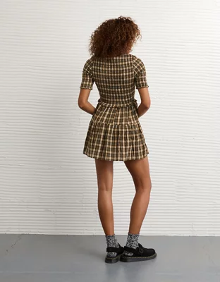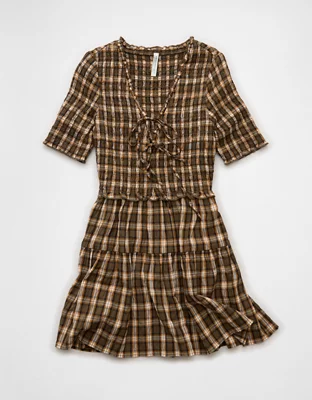 AE Puff Sleeve Tie Front Plaid Mini Dress