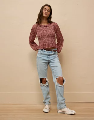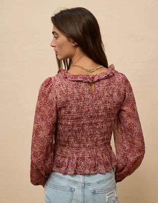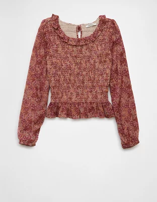 AE Long-Sleeve Smocked Bodice Ruffle Top