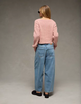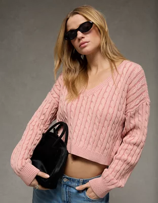 AE Cropped Cable Knit V-Neck Sweater