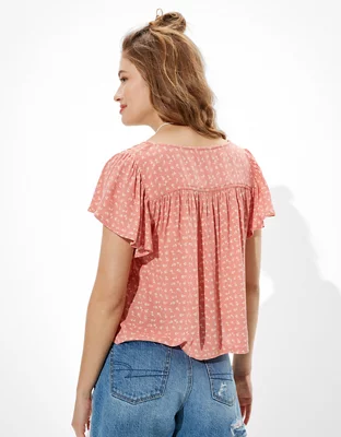 AE Flutter-Sleeve Button-Up Babydoll Blouse
