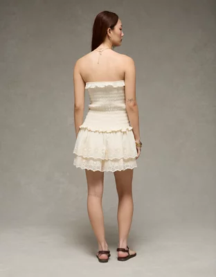 AE Vestido Corto sin Breteles con Cintura Caída y Volantes Bordados con Nido de Abeja