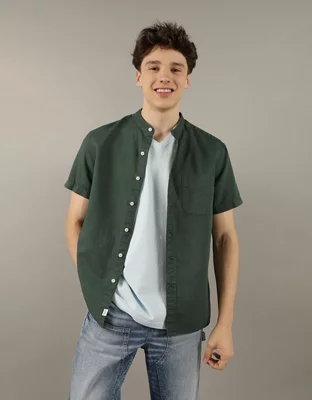 AE Short-Sleeve Band Collar Linen Button-Up Shirt