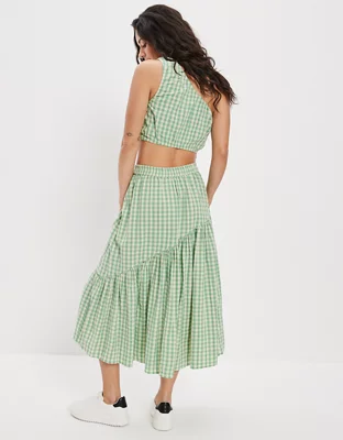 AE Gingham Asymmetrical Tiered Midi Skirt