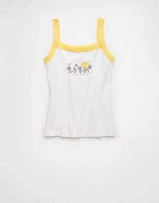 Inspiring smiles worldwide, this fitted tank features retro-inspired contrast trim, Smiley® graphics, and a soft, stretchy ribbed fabric that holds you in all day.