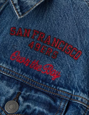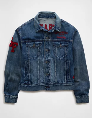Ball out in this football jean jacket, featuring graphics repping your fave team.