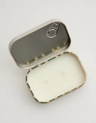 With a faux pull-tab for added character inspired by sardine tins, this tin candle with hand illustrated artwork offers a cozy glow with its two wicks, and a comforting scent.