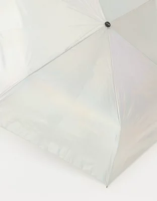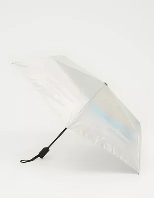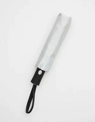 42-inch arc, 3-section shaft, automatic open & close, closed length approximatley 11.25 inches, black stell ribs, wrist strap and self fabric case, black plastic handle with silver accents.