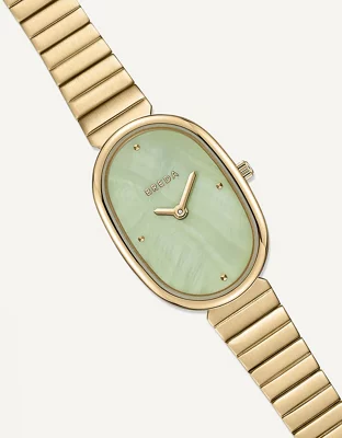 Inspired by days spent in the sun by the water and followed by evenings of indulgence. The Jane carries a delicate 23mm oval case, green colored mother of pearl dial and gold-plated stainless steel bracelet that fastens with a jewelry clasp. An effortlessly elegant and classic style.