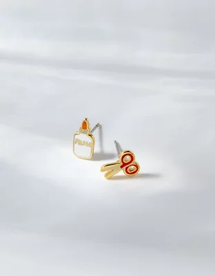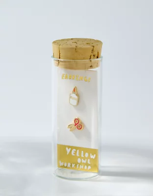 Presented in an original glass vial packaging these unique earrings blend a sense of gold glamour with a charming twist. The mismatched yet perfectly paired cloisonné petite studs are gilded in 22 karat gold and have hypoallergenic posts.