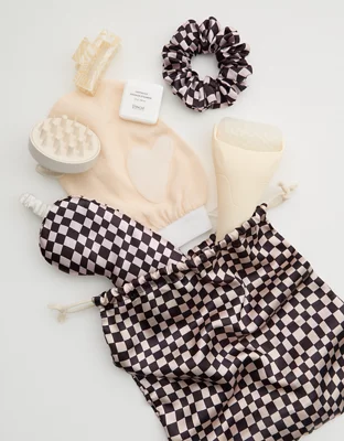 The ivory jelly tote contains the perfect deluxe assortment of spa essentials. Kit contains: ice roller, silky sleep mask, gua sha, exfoliating mitt, acetate claw clip, shower steamers and silicone scalp scrubber.