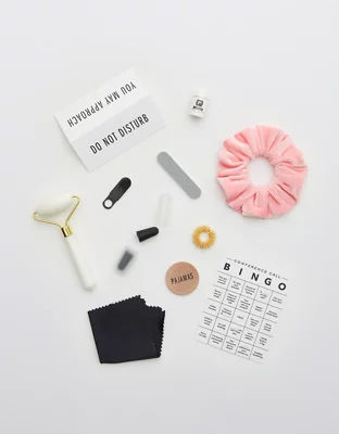 This kit comes with 11 essentials including a facial roller, acupressure ring, scrunchie, emery board, lip balm, "do not disturb" sign, webcam cover, conference call bingo card, desk yoga guide, microfiber cloth, earplugs, and a "pants vs. pajamas" decision coin.