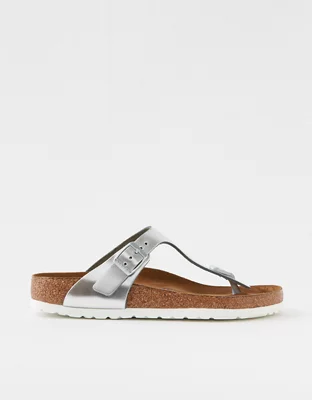 The modern thong sandal from Birkenstock - the Gizeh. This style is an iconic classic with signature support and a refined, minimalist style. A metallic shimmer finish transforms the classic look into your favorite be-seen pair. The upper is made from the skin-friendly, hard-wearing synthetic material Birko-Flor®.