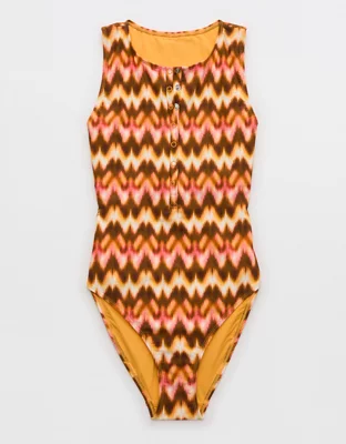 Fun and flexible, this one piece is an effortless mix of sporty and sexy with a high, snap-front neckline for versatile perfection.