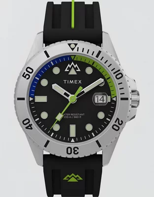 The Anchorage watch brings a brand new 42mm stainless-steel case design to the rugged Expedition North® lineup. This watch boasts the authentic look of a true diver watch, with energizing blue and lime details; sizeable luminescent hour markers and hands; a scratch-resistant, anti-reflective sapphire crystal with date magnifier for enhanced viewing; and a unidirectional ratcheting bezel for tracking elapsed time. Opt for a sporty look with a quick-release co-molded silicone strap.