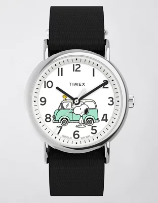 Make every day an adventure! Snoopy and Woodstock get ready to hit the open road on the clean white dial of our beloved Timex Weekender. This adorable 38mm watch features a black fabric slip-thru strap, 30m of water resistance, and an INDIGLO® backlight for effortless time-telling, day or night.
