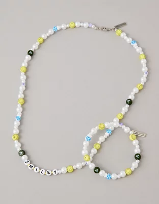 AE and Smiley® collaborated on this faux freshwater pearl necklace and bracelet set, featuring Smiley® beading, a peace sign, mushroom and eagle beads throughout.