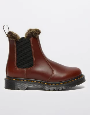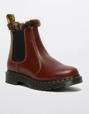 The Leonore Chelsea boot combines style with a slender, feminine silhouette, cozy faux-fur lining, and classic Dr. Marten elements DNA.