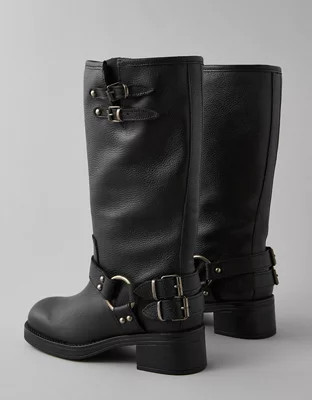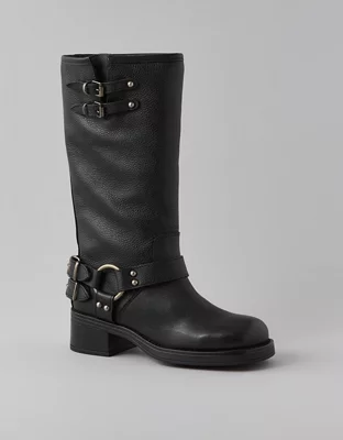 This square-toe boot features a slouchy mid-calf silhouette reinforced with strap accents and substantial buckle hardware. A wide sole with a block heel provides a solid foundation for this industrial-inspired design.