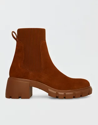 A lug platform sole and major flared heel move this classic Chelsea boot into modern territory, as does the sock-like ribbed inset for easy-on convenience.
