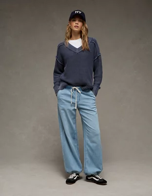 These baggy jeans offer an easy drape and stretchy comfort, featuring drawstring cuffs to convert from a wide leg to jogger silhouette. Plus, these are extra cozy thanks to a soft, brushed interior.