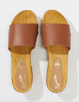 A vintage-inspired clog with a colorful leather strap and chrome-tone studs.