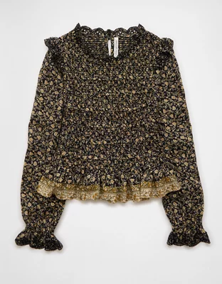 A playful, feminine babydoll blouse with smocked detailing, perfect for a flirty day-to-night look.