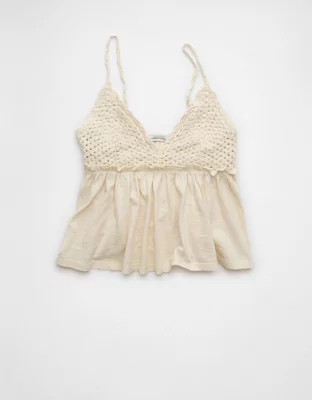 Chase the sun in this summer-ready babydoll top, featuring a crochet-inspired top for some extra boho texture.