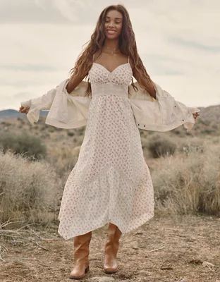 AE V-Neck Lace Inset Hanky Hem Midi Dress