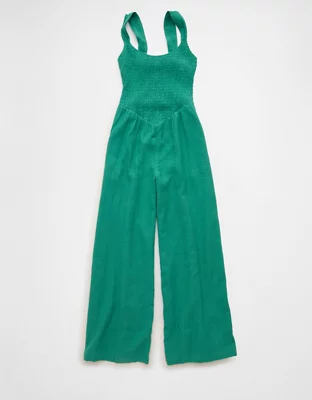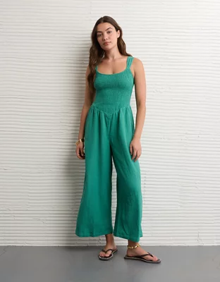 Easy and carefree, this sleeveless jumpsuit has a smocked top for a comfy fit.