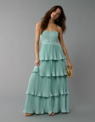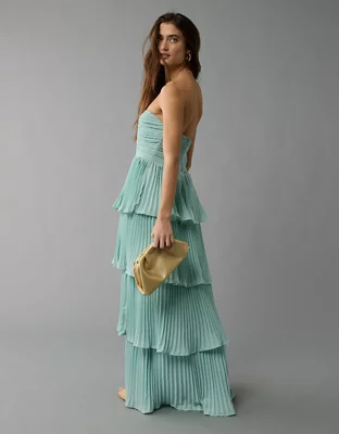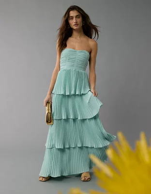 Add a touch of texture to your special occasion look with this elegant gown, featuring pleats and a tiered skirt.