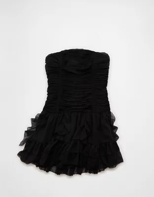 A fun, flirty strapless mini dress with playful ruched ruffles, perfect for your next holiday party or night out.