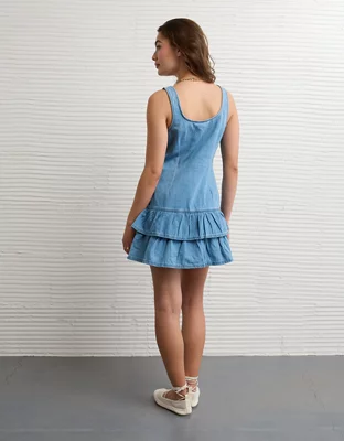 This cute-as-can-be denim mini dress features a drop-waist silhouette and tiered skirt bottom.