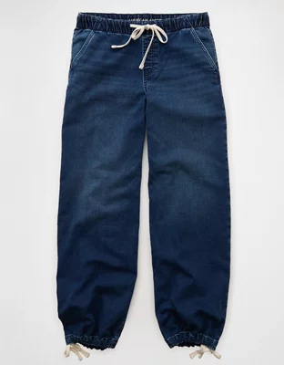 These baggy jeans offer an easy drape and stretchy comfort, featuring drawstring cuffs to convert from a wide leg to jogger silhouette. Plus, these are extra cozy thanks to a soft, brushed interior.