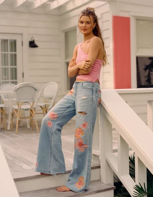 This soft and drapey pair of jeans sits super low and features a baggy, flared leg opening for a laid-back vibe. These are printed with a floral design for a one-of-a-kind look!