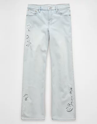 The it fit you need, with a high rise and wider leg from the thigh through the ankle. This pair features a one-of-a-kind embroidered floral print!