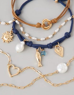 Stack those wrists with gleaming gold-tone bracelets featuring pearls, blue rope and dangling charms for an on-trend look.