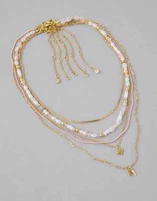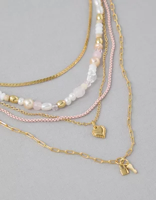 A delicate multi-strand necklace featuring polished gold-tone lock-and-key charms.