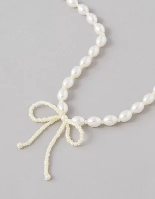 A so-femme bow adds a delicate touch to a classic strand of pearls.
