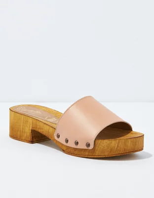 A vintage-inspired clog with a colorful leather strap and chrome-tone studs.