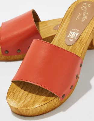 A vintage-inspired clog with a colorful leather strap and chrome-tone studs.