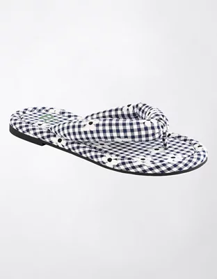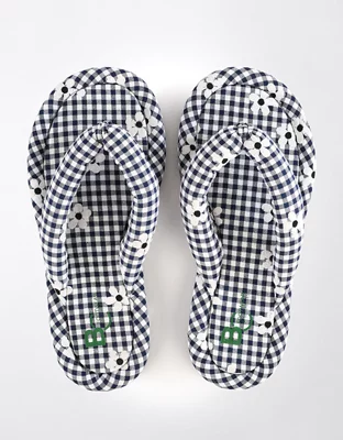 Puffy straps and a floral-accented gingham print bring whimsy and dimension to a charming flip-flop secured by a soft toe post.