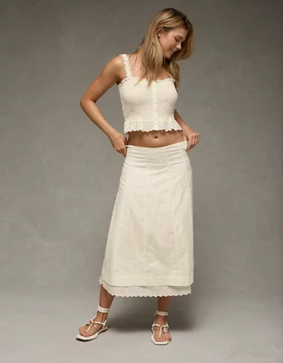 Dress it up or down. Flattering seams for a fitted and flared silhouette with smocking at back for stretch and comfort. Cute eyelet trim at hem!