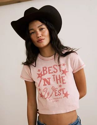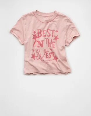 The free-spirited ethos of Stagecoach meets iconic AE comfort in this shrunken graphic tee, featuring a western-themed graphic and soft slub cotton jersey construction.